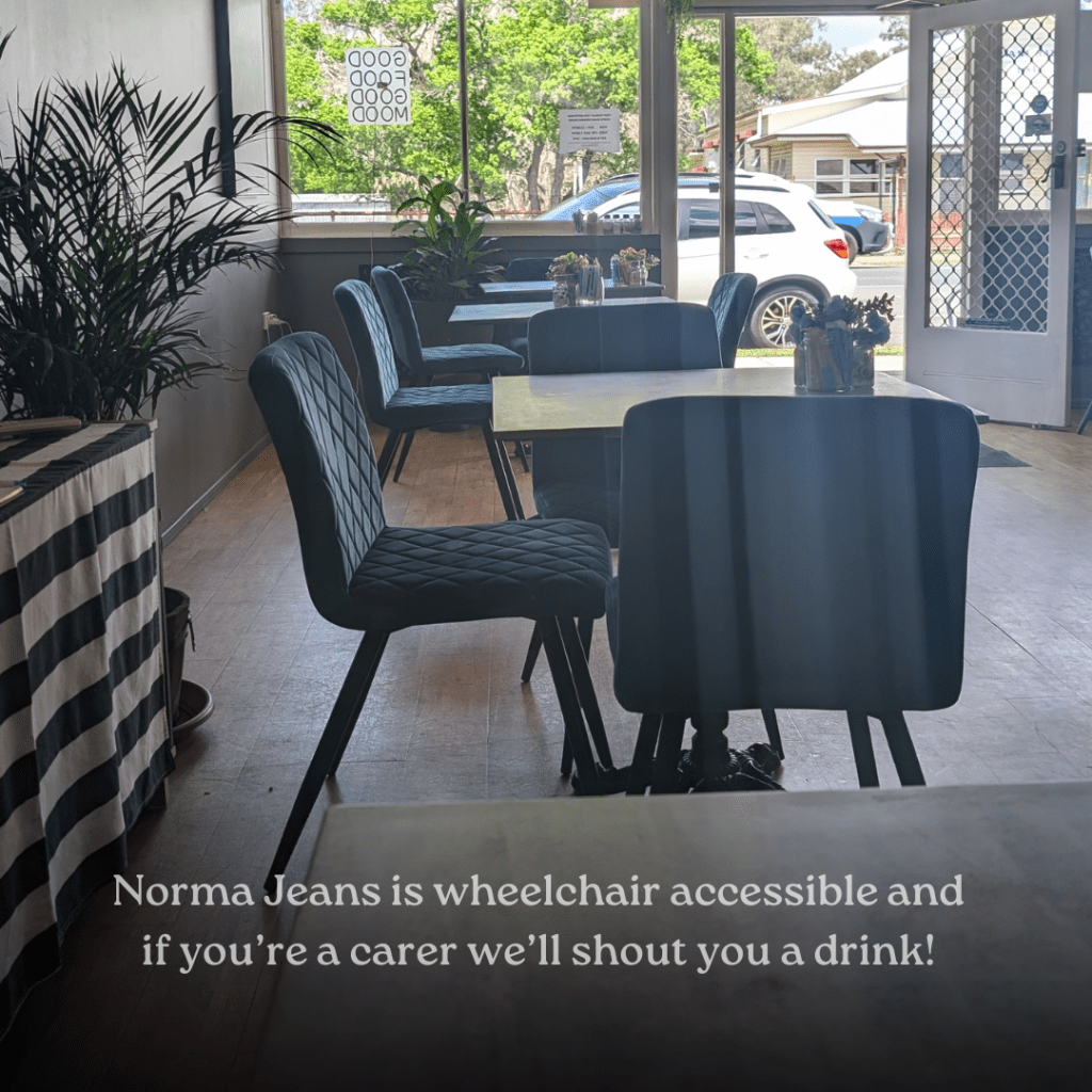 Norma Jeans Cafe is also Wheelchair accessible and if you’re a carer, we’ll shout you a drink!